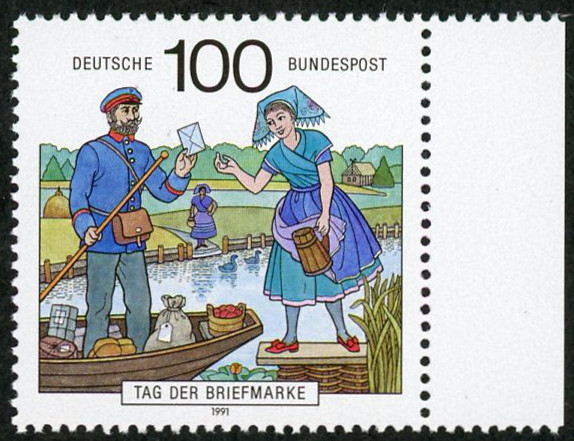 Tag der Briefträger vom Seitenrand mit Plattenfehler nach Michel: Rasterausfall unter dem Baum rechts des Hauses