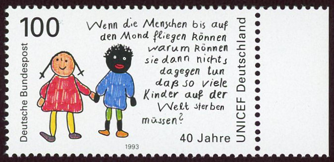UNICEF vom Seitenrand mit Plattenfehler nach Schantl : blauer Strich links neben dem "m" von "müssen"