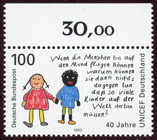 UNICEF vom Oberrand mit Plattenfehler nach Friedrich Bd. 9: Punkt über "t" von "nichts"