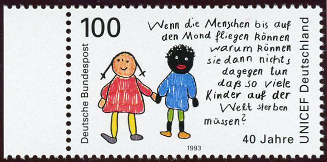 UNICEF vom Seitenrand mit Plattenfehler nach Philotax: schwarzer Punkt am "n" von "fliegen"