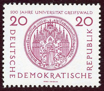Greifswald mit PlF nach Schrage VI:Punkt im Kopf des "R" von "DEMOKRATISCHE" sowie Bruch der Außenlinie neben dem "U" von "DEUTSCHE"