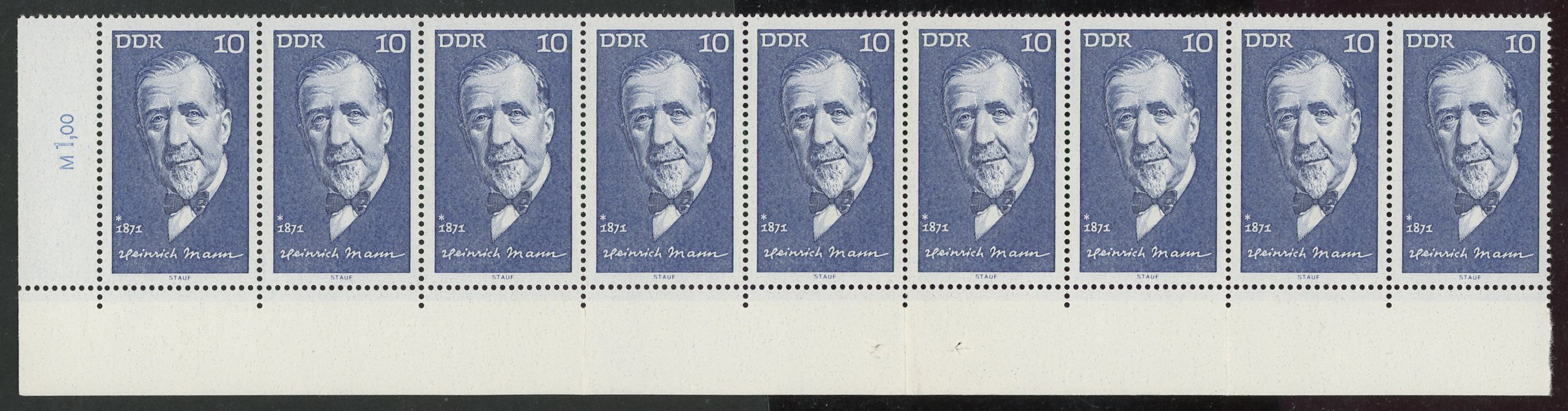 H. Mann im 10er-Streifen vom unteren Eckrand mit vier ! PlF nach Schrage VN : dunkler Bogen links neben der "1" der Wertziffer