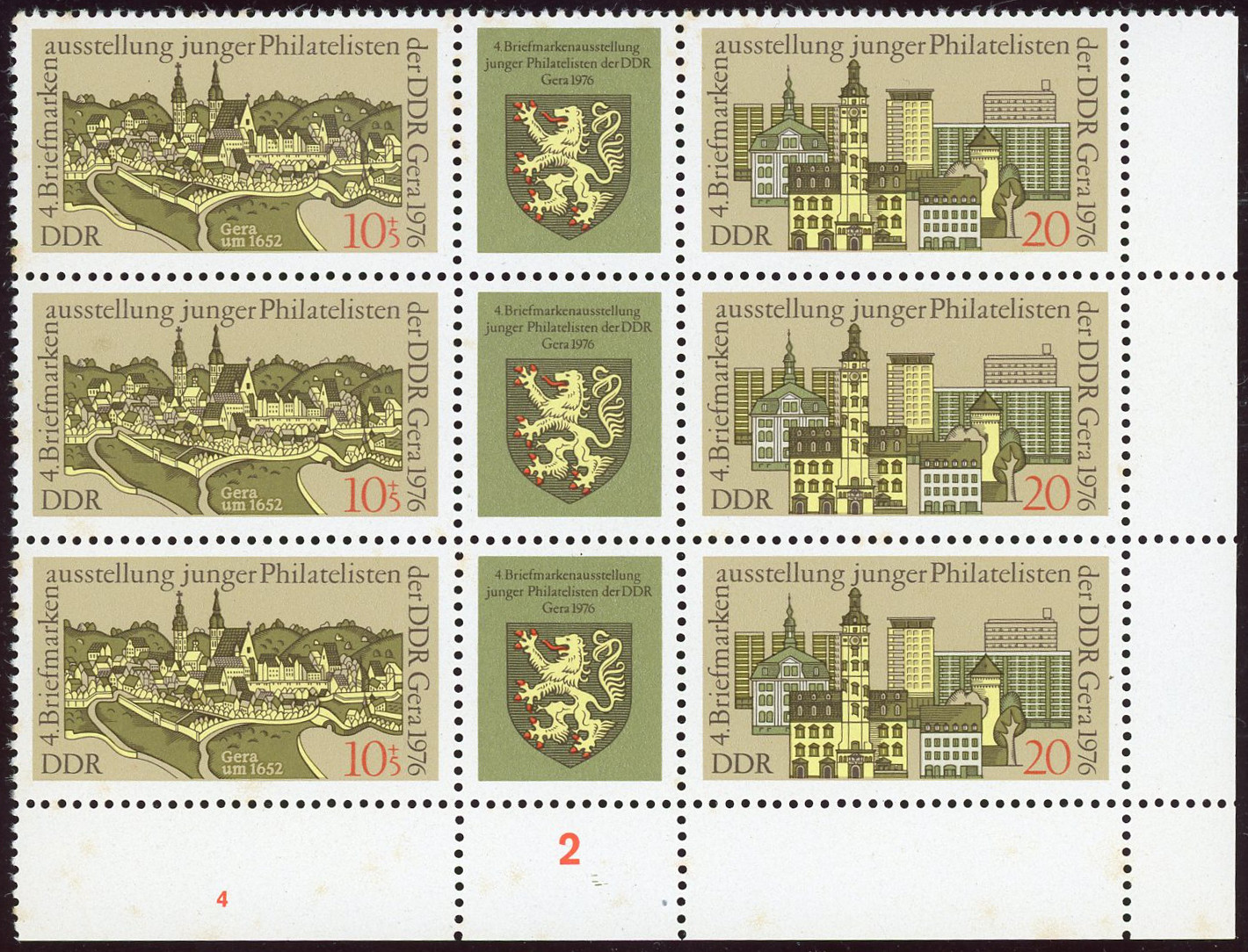 Gera im 9er-Block-Zdr vom Eckrand mit DV-Nr "4" mit PlF nach Richter : großer grünbrauner Fleck im Haus unter "Ph" von "Philatelisten"