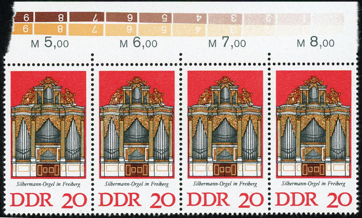 Freiberger Dom im 4er-Streifen vom Oberrand, rechte Marke mit PlF nach Schrage VI: quadratische Fensterzeichnung über dem "O" von "Orgel" links oben gebrochen