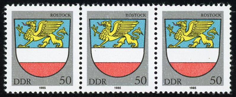 Rostock im 3er-Streifen mittl. Marke mit PlF nach Michel: zwei Linien im Greifenflügel links... mehr